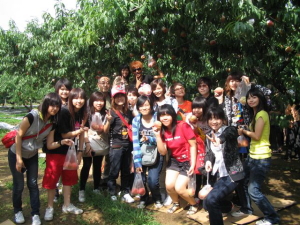 日本語の授業は、「文法」「聴解」「異文化理解」などの内容で、実用的な表現が中心でした。観光文化コースの学生17名とは折鶴などで交流。今回折った折鶴は、本学が来年3月に予定している大仁科技大学での海外研修の際に交換することを約束しました。恒例の本学中国語講座履修者との交流会では中国語で会話をしたり、約100名の参加者全員で太極拳に取り組みました。学生主体の団体「杏力隊」とのカレーライス作りも大好評。富士山、山梨で桃狩りも体験しました。