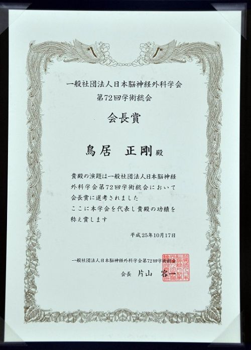 本年10月16日〜18日、横浜国際会議場で開催された第72回日本脳神経外科学会で、医学部脳神経外科教室の鳥居正剛助教が会長賞を受賞しました。