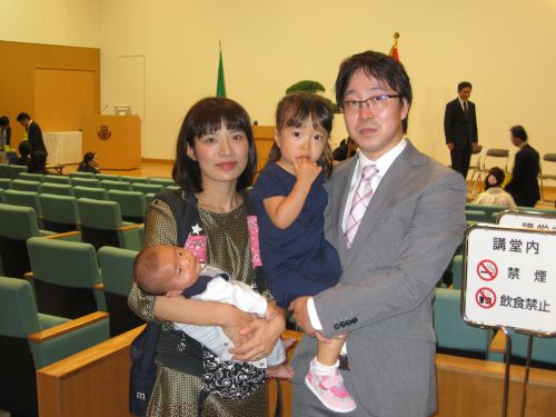 式典終了後、各研究科・学部に分かれて卒業生一人ひとりに学位記が授与されると、厳粛な空気はようやくくつろいだ雰囲気に変わり、卒業生が恩師を囲んで記念写真を撮ったり、晴れ姿を参観した家族からお祝いの言葉を受けたりする姿が会場のあちらこちらで見られました。医学研究科で博士号を取得した中村健大さんは、医師として勤務しながら夜中に勉強し1年かけて博士論文を仕上げたということで、2人の幼子とともに夫の晴れの舞台を見守った妻の沙織さんは「家族一緒に遊びに行きたいこともありましたが、よく頑張ったと思います。本当に良かったです」と祝福の言葉を贈っていました。