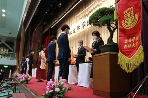 式では学業などに優秀な成績を残した学生に表彰状が贈られ、全員で校歌を声を出さず黙唱して閉式となりました。