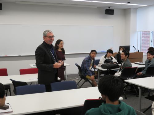 その他、両氏は総合政策学部 大川学部長とのミーティング、総合政策学部の教員とのミーティング、国際交流センターにおけるミーティング、今年度のHELMoカレッジへの交換派遣学生との顔合わせ、グローバルセミナー、井の頭キャンパスと三鷹キャンパスの見学、生け花体験を行ないました。その中からいくつかご紹介いたします。