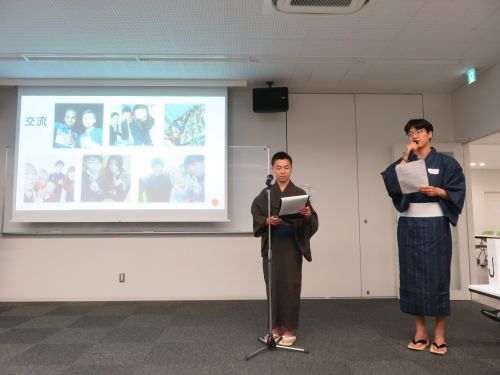 今回は、留学生・テキサスA&M大学インターンシップ生の36名を含む学生116名、教職員42名の総勢158名が参加しました。今回の国際交流の集いはテーマを「日本の夏」とし、浴衣に身を包んだ3名の学生司会者、日本語(外国語学部 劉雨露さん)・中国語(外国語学部 繁田里菜さん)・英語(総合政策学部 碇大毅さん)による3ヶ国語で司会進行が行われました。