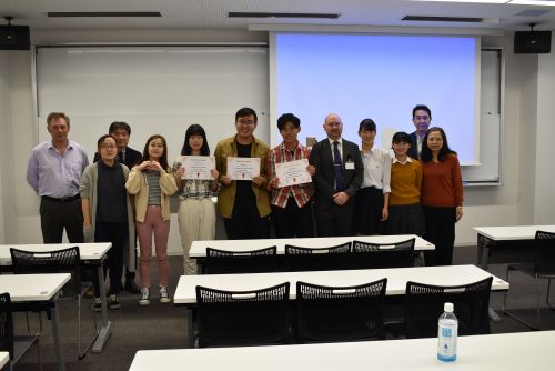 その結果、一位は杏林大学の個人(男子留学生)、二位は、県立大和西高校の高校生、3位は杏林大学の個人(女子留学生)に決まり、Jason特任講師から賞状と副賞がそれぞれ手渡されました。