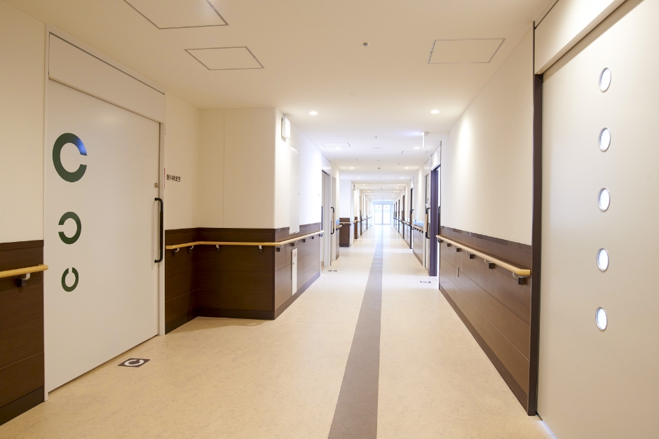 病棟には、術後間もない方やロービジョンの方などが入院しています。こうした患者さんが、より快適な入院生活を送れるよう、窓からの日差しを取り込み明るくする、段差を排除、色彩コントラストを強調した補助線を引いたり、部屋番号などの表示を大きくし、フットライトをつける等の様々な工夫をしています。また、「武蔵野の杜」をコンセプトに、ドア・テーブル・椅子等に木材を使用し、自然の色調を取り入れることで、心地のよい空間を演出しています。