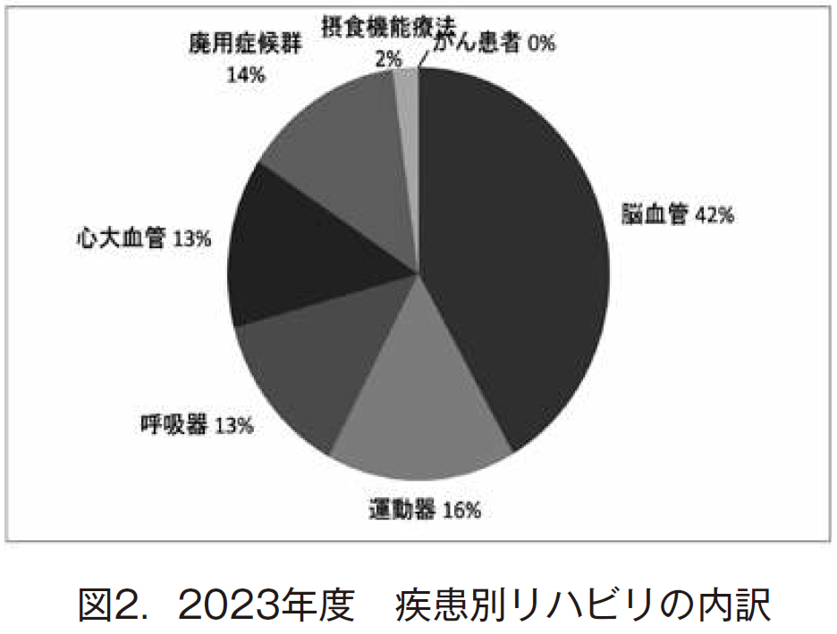 リハビリが関わる病態は、⑴脳卒中・脳外傷、⑵脊髄損傷・疾患、⑶関節リウマチを含む骨関節疾患、⑷脳性まひなどの発達障害、⑸神経筋疾患、⑹四肢切断、⑺呼吸・循環器疾患である。1987年のリハビリ室発足当初の対象は整形外科疾患が約80%を占めていた。2023年度の入院患者を診療科別でみると図 1 のごとく、脳神経外科16.2%、脳卒中科12.8%、循環器内科10.5%、整形外科10.3%、呼吸器内科6.4%の順であった。リハビリ介入患者の平均年齢は71.8歳であり、70歳代、80歳台で入院処方の約56%を占めている。診療報酬上の疾患別リハビリ区分の内訳は図 2 のごとく、脳血管疾患41.7%、運動器疾患16.0%、廃用症候群13.6%、心大血管疾患13.4%、呼吸器疾患13.0%、摂食機能療法2.1%であった。