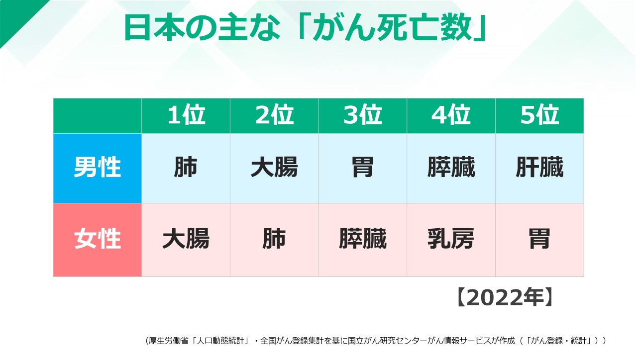 現在、「がん」になる人は “2人に1人” と言われています。喫煙や飲酒、生活習慣の乱れが蓄積し、50歳前後から発症していく傾向があります。なお、「がん」の発症部位は心臓を除いたほとんどすべての臓器となります。