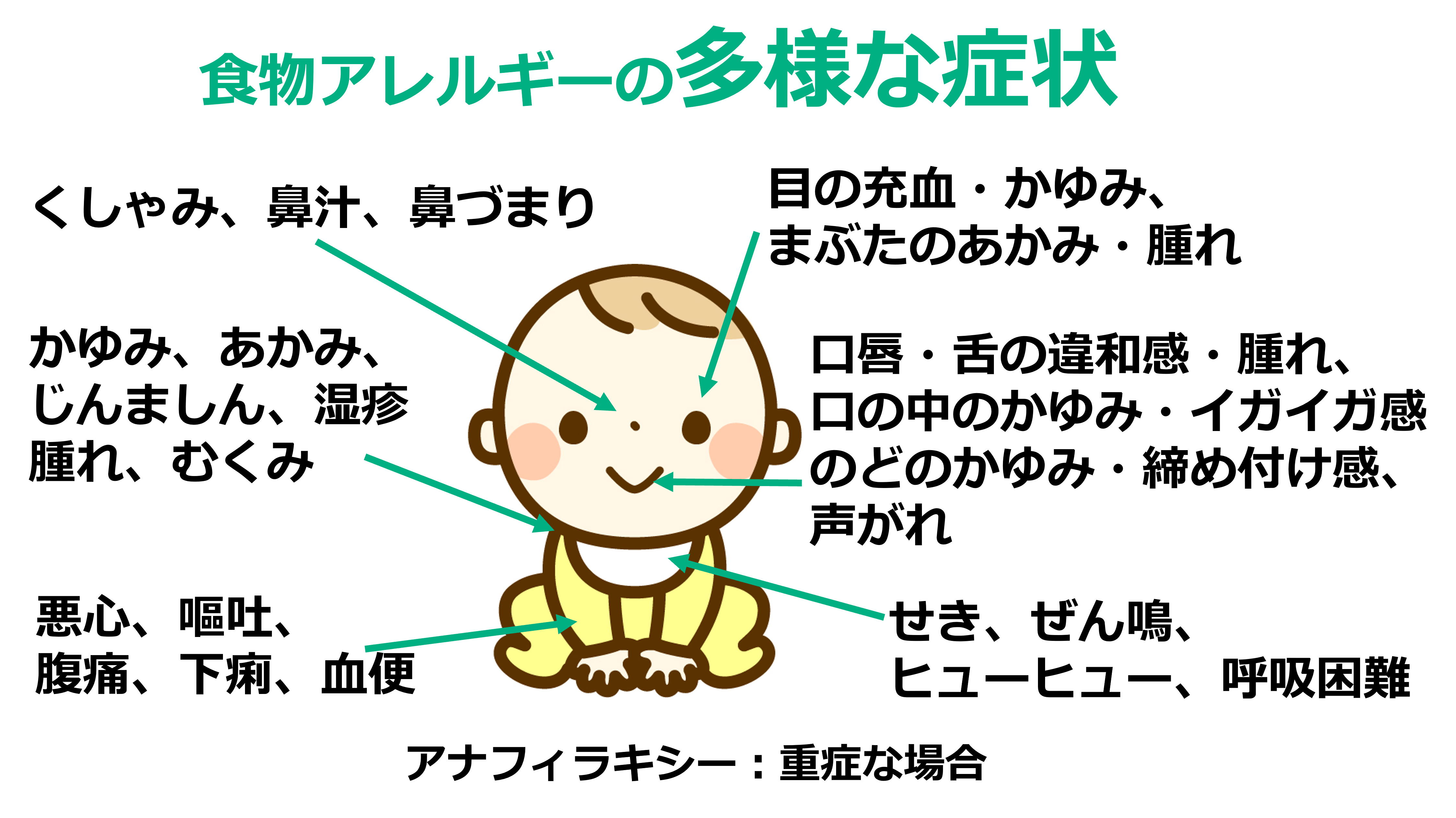 もっとも多くみられる症状は皮膚症状(かゆみ・あかみ・じんましん・湿疹・腫れ・むくみなど)で、食物アレルギーのある子どもの約9割にみられます。さらにひどくなると、ぐったりして意識障害が起こり、血圧が低下する「アナフィラキシーショック」といわれる危険な病態になることもあります。