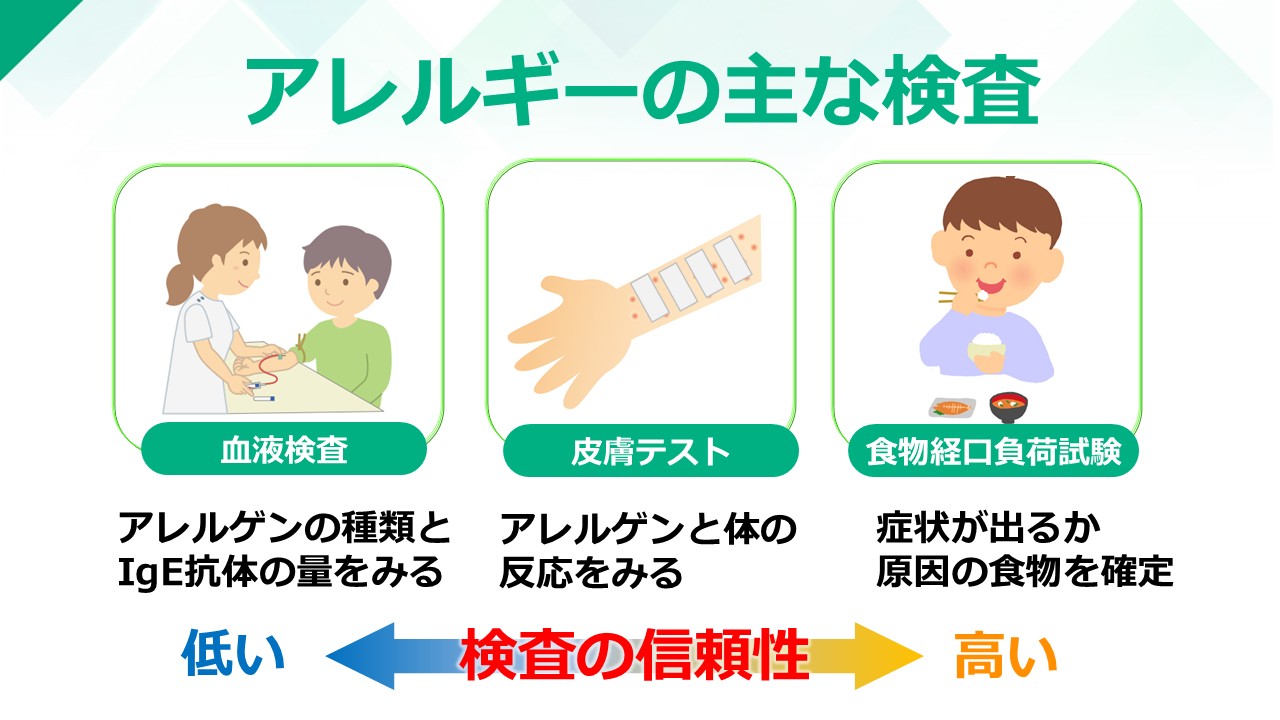 食物アレルギーの診断では、まず詳しい問診を行い、症状が出た時の状況、食べたものや症状の種類や出るまでの時間などを確認します。さらに、疑わしい食物に対する血液検査(IgE抗体)や皮膚テスト、実際に食べて症状が出るかを確認する食物経口負荷試験を行います。ただし、ある食物について血液検査で陽性でも、実際にその食物を食べて症状が出なければ食物アレルギーではありません。