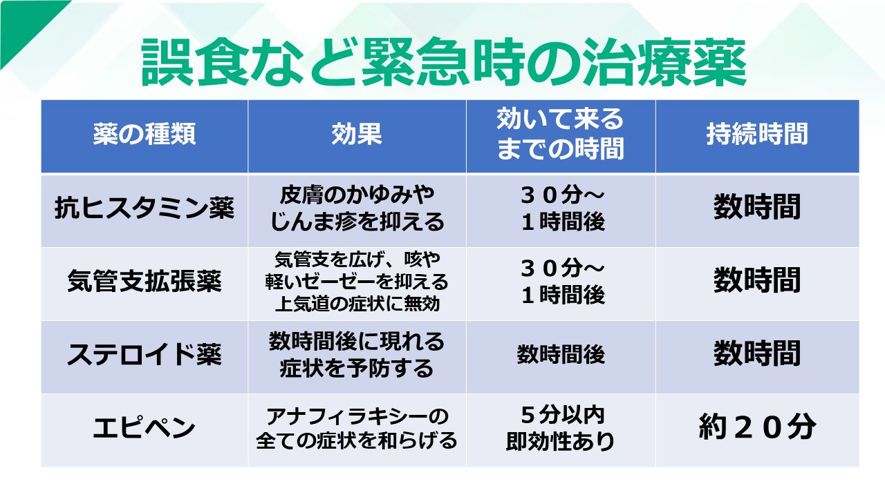 食物アレルギーの患者さんには、誤食など緊急時のための下記のような治療薬を事前に処方しています。医師の指示に従ってこれらの治療薬を使用し、改善傾向がなければ速やかに医療機関を受診してください。特にエピペンを使用した場合には、症状が改善しても必ず救急車を呼んで医療機関を受診してください。