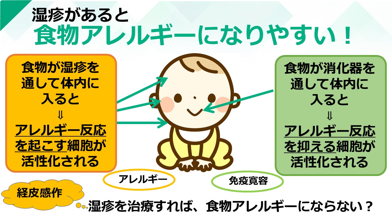 つまり、乳児にアトピー性皮膚炎がある場合には皮膚疾患をできるだけ早く治し、皮膚のバリアをしっかり守り、適切な時期(生後5-6か月)に離乳食を開始して、少しずついろいろな食べ物を食べることが食物アレルギー予防にも有効だということになります。