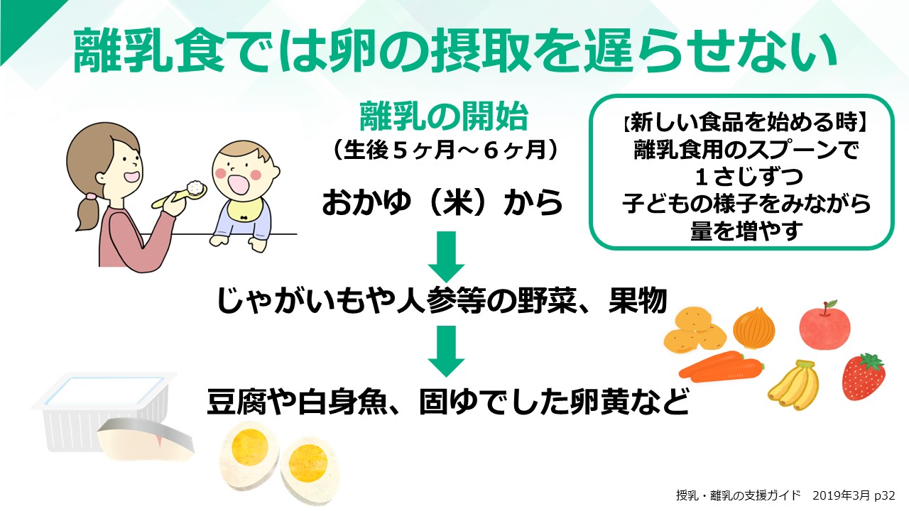 以前は「アレルギーの原因となる食べ物を食べさせなければ、食物アレルギーにならない」と考えられており、アトピー性皮膚炎がある赤ちゃんには卵アレルギーを心配して離乳食で卵は除去するよう指導されたこともありました。