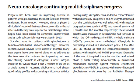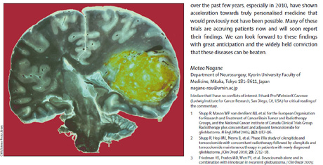 論文は、2010年の1年間に論文として発表された悪性脳腫瘍に関する重要な知見について、特に優れたもの、本疾患の治療上の進歩に当たるものを厳選し寸評しています。