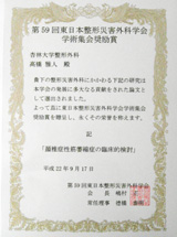 高橋助教は「この名誉ある賞を受賞できたのは、整形外科学教室の里見和彦教授、市村正一教授、望月一男教授をはじめ医局員の皆様のご指導の賜物と感謝しております」と話しています。