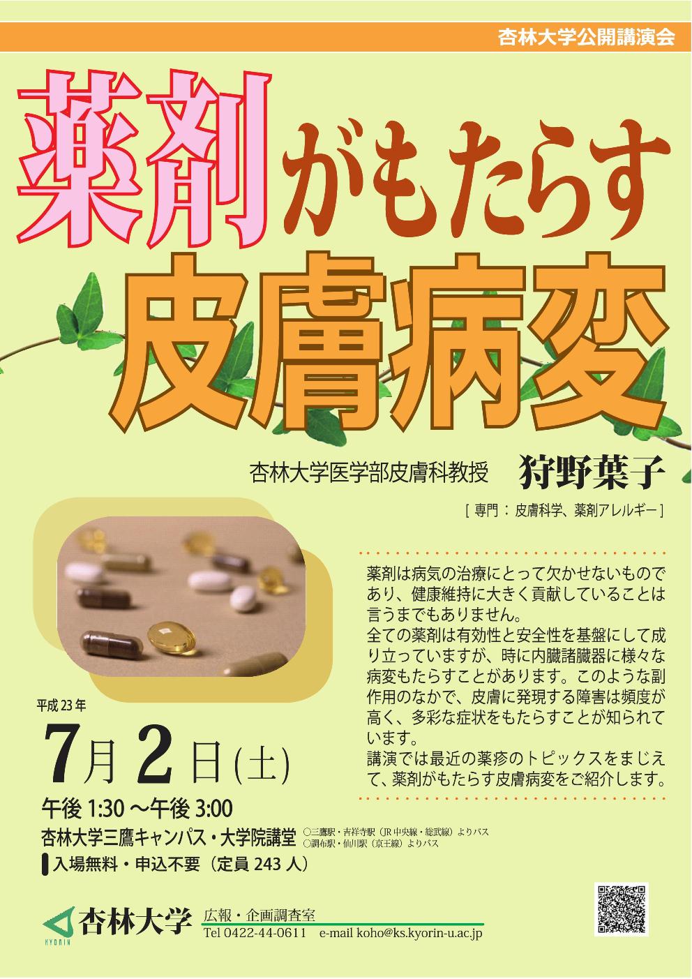今回は、当院の皮膚科教授 狩野 葉子 医師が「薬剤がもたらす皮膚病変」について講演をいたします。