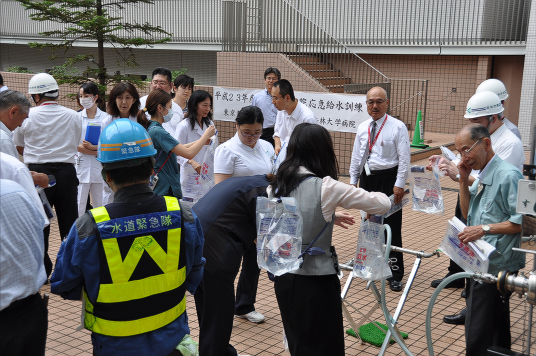 また、病院内のセンタープラザでは、自衛消防隊員、教職員、関連事業所の職員も参加しての初期消火訓練も同時に実施しました。災害拠点病院である杏林大学病院では、東京都水道局、三鷹市水道部より消火栓から病院の地下にある受水槽への応急給水訓練が実施されました。