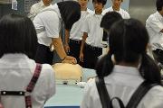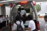 その後クラスごとに分かれ高度救命救急センター内の病棟や処置室などを見学、心臓マッサージの方法や実際の機器を使用した検査など慣れない体験に緊張しながらも真剣に取り組んでいました。見学の最後には消防庁の職員より救命救急現場の現状に関する説明を受けドクターカーへの体験乗車も行いました。