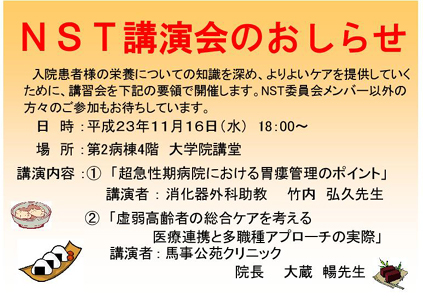 病院・診療科についてNST講演会のおしらせ<医療従事者の皆様へ> 作成日時 2011年10月17日 入院患者様の栄養についての知識を深め、よりよいケアを提供していくために、講習会を下記の要領で開催します。NST委員会メンバー以外の方々のご参加もお待ちしています。 日 時 :平成23年11月16日(水) 18:00~ 場 所 :第2病棟4階 大学院講堂 講演内容 : (1)「超急性期病院における胃瘻管理のポイント」 講演者 : 消化器外科助教 竹内 弘久先生 (2)「虚弱高齢者の総合ケアを考える医療連携と多職種アプローチの実際」 講演者 : 馬事公苑クリニック 院長 大蔵 暢先生