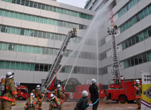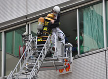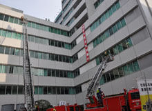 当院のセンタープラザで実施された演習は、地震発生後、外来棟3階の給湯室から出火したとの想定のもと、火災発生の連絡を受けた警備室より直接119番通報を行う訓練から開始されました。通報を受け現場に到着した三鷹消防隊に、火災発生を確認した当院の自衛消防隊が状況を報告。外来棟3階と7階(屋上)にいる逃げ遅れた職員3名をはしご車2台で救出した後、三鷹消防隊員(ポンプ車2台)と自衛防災隊員による、火元に向けての一斉放水訓練を行いました。