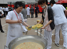 演習終了後には栄養部による炊き出し訓練も行われ、個別に包まれたご飯と豚汁が参加者に配給されたほか、はしご車の搭乗体験も行われました。