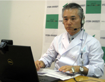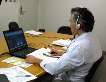 この講演会のプログラムのひとつとして遠隔医療ライブが行われ、中国からは北京二十一世紀病院(北京)、日本からは当院の他に亀田総合病院(千葉県鴨川市)、麻田総合病院(香川県丸亀市)などの5つの病院が参加しました。遠隔医療ライブでは講演会会場の中国大使館を中心に各病院をネットワークで繋いで、遠隔画像診断の実例デモンストレーションが実施され、当院からは消化器内科の森秀明准教授が参加しました。パソコンに装備したウェブカメラとマイク・イヤホンを使用して、離れた場所にいてもまるで同じ会場で会議に参加しているような雰囲気の中、森准教授はパソコン画面に映し出されたエコー画像を読影し他の病院の医師と症例検討を行いました。デモンストレーションを終えて森准教授は「初めて遠隔医療に参加しましたが、各領域の専門家が一堂に会しなくても、ネットワークを介して、症例のディスカッションができるので、医師の過疎地への支援などに有用であると実感しました」と話していました。