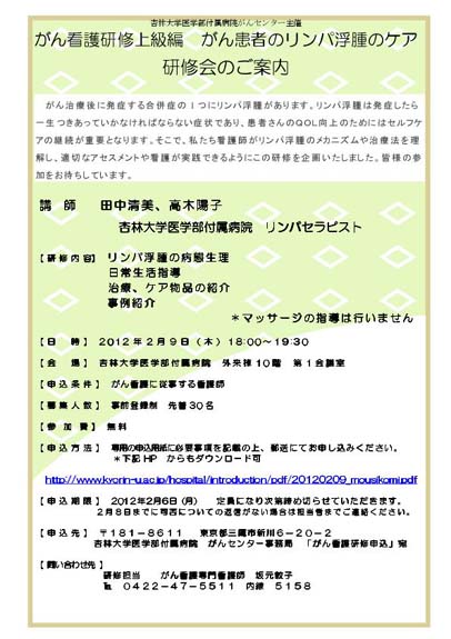 病院・診療科について【がん看護研修・上級編】がん患者のリンパ浮腫のケア研修会のご案内<看護師の皆様へ>