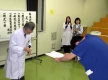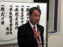 また、卒後教育委員会委員長の赤木美智男教授からは、「2年間の厳しい研修をよく頑張りました。研修期間中は評価表があり、その都度振り返ることができました。これからは自分で自分を振り返って見つめなければなりません。仕事に対する日々の取り組み方、姿勢の違いが長い間には大きな差を生むのでこれからも謙虚な気持ちでやって下さい」との挨拶がありました。