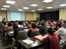 各日とも約40名の新入職看護師が参加し、2グループに分かれて講義とデモンストレーションを交互に受けました。講義では、石巻赤十字病院の東日本大震災における初動記録映像の視聴と、新入職者が知っておくべき災害対策についての説明がありました。デモンストレーションはセンタープラザで行われ、消火器と屋内消火栓の使用方法について学園の防火管理者からデモンストレーションがあったあと、看護師たちが実際に消火器を手にして消火訓練を行いました。