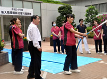 この研修は、看護部業務管理委員会が新入職看護師全員に対して、大勢の患者さんをかかえる病院職員として防災意識を高め、防災行動力の向上を図ることを目的に毎年行っているものです。