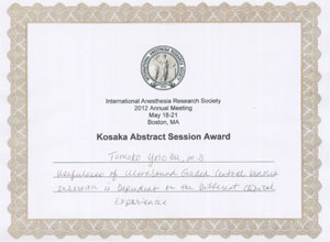 麻酔科の萬知子教授が平成24年5月18日(火)~21日(月)に米国マサチューセッツ州のボストンで開催されたInternational Anesthesia Reseach Society(以降IARS)でKosaka awardsを受賞しました。