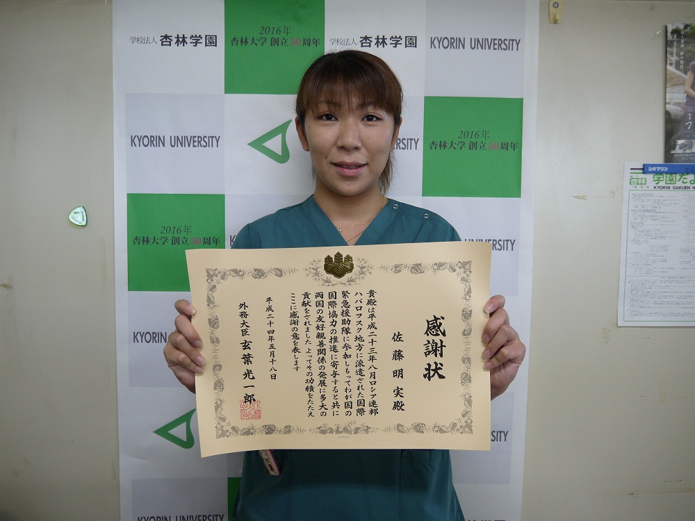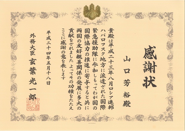 山口センター長と佐藤看護師は、昨年8月にロシア連邦ハバロフスク地方で発生した石油精製工場の火災事故において、全身火傷の重傷を負い当院高度救命救急センターに搬送された患者の治療にあたったことについて、国際協力及び日ロの友好親善関係の発展に貢献したとして感謝状が贈られたものです。
