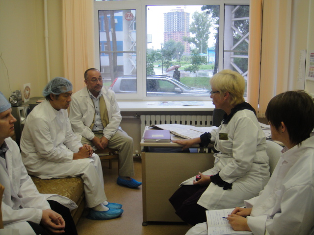 現地で打合せを行う山口教授とロシア人医師たち 「今後の両国の親しみがますます深まることを期