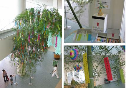 医療サービス委員会と患者サービス室が中心となり準備を行い、「家族がずっと健康でいられますように」、「はやくけががなおってプールでおよげますように」などの願い事が書かれた短冊や、色鮮やかな飾りが付けられた大きな笹竹が置かれ、外来棟に彩りを添えています。また、笹飾りの下には短冊が用意されており、どなたでも願い事をご記入いただけます。