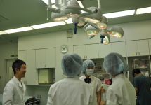 続いて一行4名は、小泉講師と八木橋 厳助教の案内で高度救命救急センターの初療室や手術室、病棟内を見学し、施設設備や器具などについて詳しい説明を受け、熱心に耳を傾けていました。中でも、手術室の天井に設置されている『無影灯』の影の出来ない仕組みにとても興味をひかれたようで、しばらくの間観察をしていました。