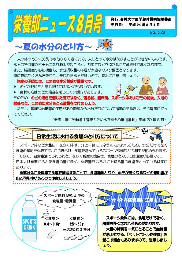 病院・診療科について「栄養部ニュース8月号」を掲載しました 作成日時 2012年08月07日 栄養部では、行事食の予定や旬の食品・健康増進のための情報など、さまざまな内容を取り入れた栄養部ニュースを毎月発行しています。 平成24年8月1日発行の8月号の新聞は、下記よりご覧いただけます。 ◆栄養部ニュース8月号(252KB)