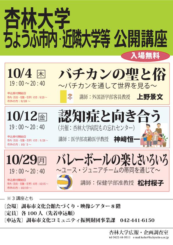 杏林大学では今年度も本学の特色を活かして、身近でお役に立つような医療・健康・社会問題・文化などをテーマに、公開講演会・公開講座を実施いたします。
