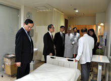 一行は松田博青理事長と挨拶を交わした後、松田剛明副理事長や齋藤英昭副院長から当院の概要や新病棟の特徴、栄養部の施設・設備等について説明を受けました。続いて行われた病院内の見学では、新病棟の換気システムやHCU・CICUの患者のプライバシーに配慮した構造などをメモや写真を撮りながら熱心に見学していました。