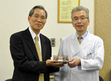 最後に陳病院長は「杏林大学病院の最新の設備を見学させていただき、大変勉強になりました。ぜひ新しい病院の参考にしたいと思います」と感謝の言葉を述べ、友好の記念に甲能直幸病院長へ台湾大学のミニチュア模型等が贈られました。甲能病院長は「台湾大学病院が素晴らしい病院を建設する日を楽しみにしています」と挨拶し、終始和やかな雰囲気の中、病院見学は終了しました。