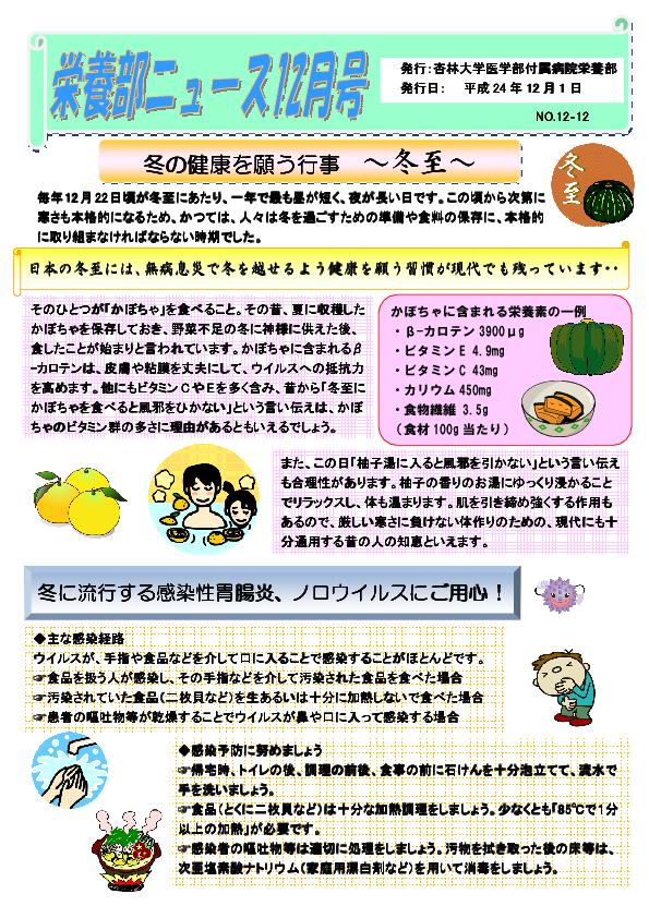 病院・診療科について「栄養部ニュース12月号」を発行しました 作成日時 2012年11月28日 栄養部では、行事食の予定や旬の食品・健康増進のための情報など、さまざまな内容を取り入れた栄養部ニュースを毎月発行しています。 平成24年12月1日発行の12月号の新聞は、下記よりご覧いただけます。 ◆栄養部ニュース12月号(373KB)