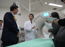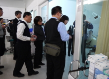 一行は、甲能直幸病院長、齋藤英昭副院長と挨拶を交わした後、竹中工務店の菅原努氏から、付属病院全体の施設設備や間取り、免震構造やオペレーティングセンター等について説明を受けました。また、クリティカル部門を麻酔科 萬知子教授、検査室関係を臨床検査部 高城靖志技師長、放射線部門を放射線部 大戸真喜男技師長がそれぞれの説明を行い、それに対し王副院長は色々な質問をしていました。