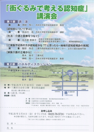 病院・診療科について「街ぐるみで考える認知症」講演会(3/16)のお知らせ 作成日時 2013年01月10日 平成25年3月16日(土)、三鷹市公会堂に於いて認知症高齢者に対する地域連携についての講演会が下記のとおり開催されます。 (クリックすると大きいサイズの画像が表示されます)