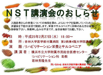 病院・診療科についてNST講演会のお知らせ 作成日時 2013年01月18日 入院患者さんの栄養についての知識を深め、よりよいケアを提供していくために、講習会を下記の要領で開催します。栄養やサルコペニアに興味のある方は是非御参加下さい。事前申し込みは不要です。当日会場までお越し下さい。 【日 時】平成25年2月27日(水) 18:00~ 【場 所】杏林大学医学部付属病院 第2病棟4階 大学院講堂 【演 題】リハビリテーション栄養とサルコペニア 【講演者】横浜市立大学附属市民総合医療センター リハビリテーション科 助教 若林秀隆先生
