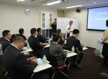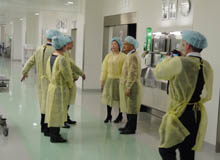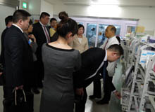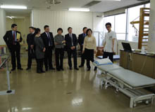 一行はまず、齋藤英昭副院長から当院の概要やTCC・ICU・HCUの違い、SPDシステム等の説明を受けました。ICUやHCUの個室に興味を持った訪日団からは、患者の感染率や入院費用、看護師の配置等、積極的にたくさんの質問がありました。続いて行われた見学では、ICUや整形外科病棟、リハビリテーション室、脳卒中センター専用のリハビリテーション室の他に、訪日団からの強い希望で医療器材滅菌室や手術室等を回り、写真を撮ったり話し合いをしながら真剣に見学していました。