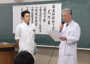 式では甲能直幸病院長より研修医代表の安藤直朗さんへ修了証が手渡され、「皆さん本日は修了おめでとうございます。この2年間、一緒に研修を行ってきた仲間との絆は医師の人生でとても大切です。これから後期研修が始まり、辛いこともあると思いますが、精進して立派な医師になってください」と激励の言葉が贈られました。