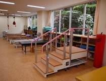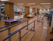 外来患者さんがなるべくエレベーターや階段を使用せずにリハビリ室に来られるように、地下1階から1階へ移転。今までの設備はもちろんのこと、リハビリ室内に長い廊下を設置して歩行訓練等を行いやすい環境になっています。