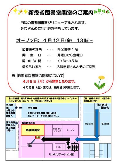 病院・診療科について患者図書室は4月12日(金)に移転・開室します 作成日時 2013年04月04日 当院の患者図書室がリニューアルされます。 みなさんのご利用をお待ちしています。 オープン日:4月12日(金) 13時~ 新図書室の場所・・・第2病棟1階 開室日・・・月曜日から金曜日 開室時間・・・13時~15時 借りられる方・・・入院患者さんとそのご家族 ※旧患者図書室は4月8日(月)から閉室となります。 4月5日(金)までは、通常通り開室します。 *クリックすると大きいサイズの画像(PDF)が表示されます。