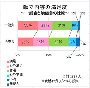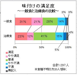 また、一般食・治療食別に結果を比較検討したところ、味付けについて「満足」・「やや満足」と回答された方が、一般食で52%であったのに対し、治療食は35%であり、治療食が満足度が低い結果となりました。理由として、治療食では食塩量を制限していることで満足度が得られにくかったことが考えられますが、限られた食塩量の中で満足して頂ける食事の検討を重ねて参ります。
