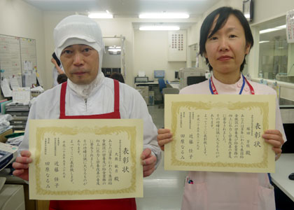 病院・診療科について栄養部の塚田芳枝科長と大熊敏彦調理師が給食優良従事者表彰