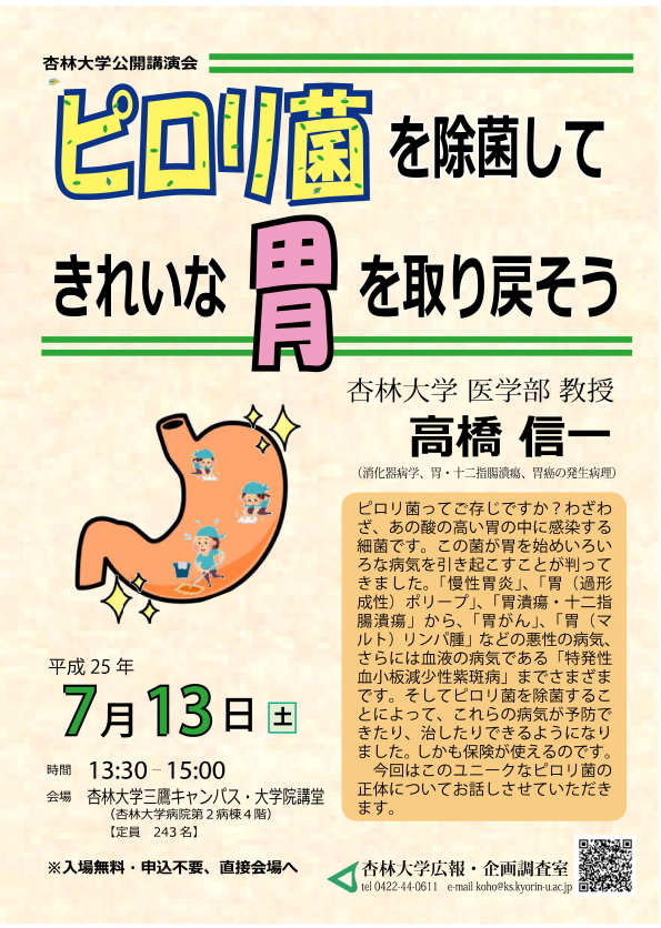 病院・診療科について【公開講演会のお知らせ】 7/13(土) 「ピロリ菌を除菌して きれいな胃を取り戻そう」