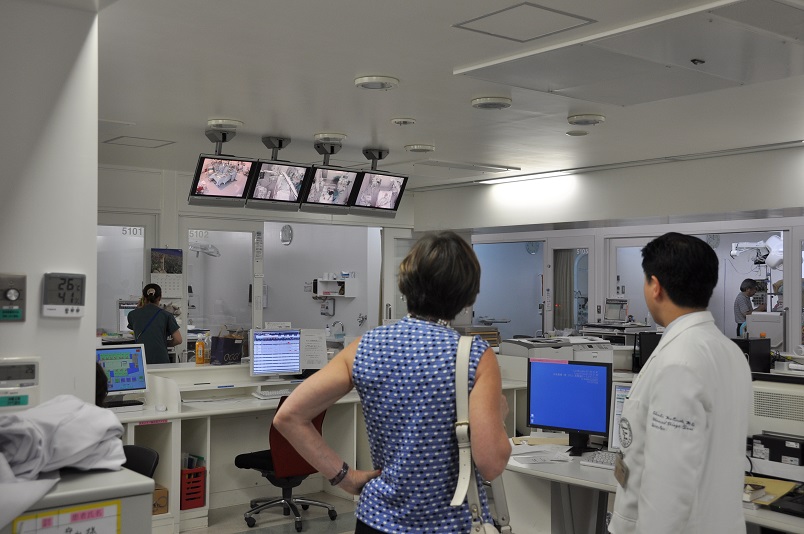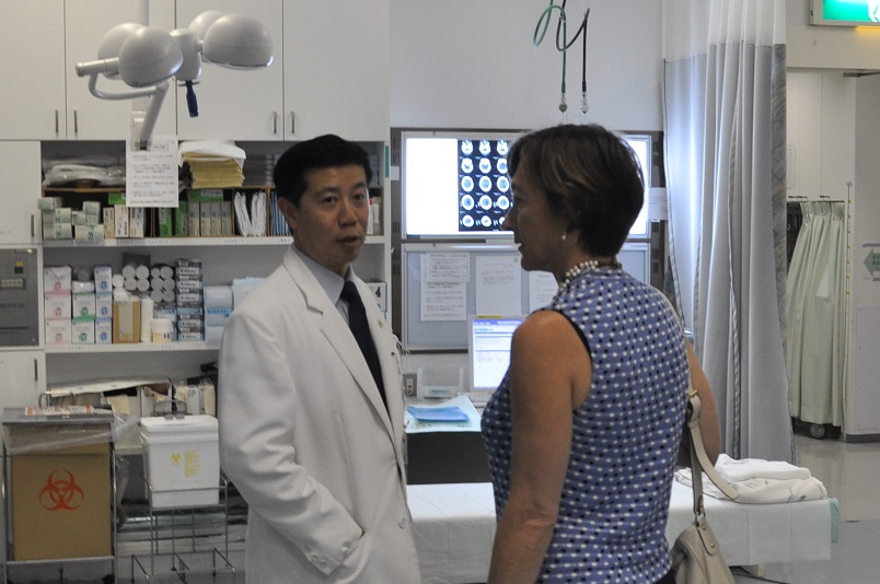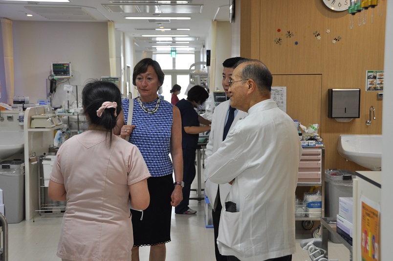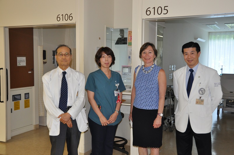 視察に先立ち、Glazer看護学部長は当院・甲能直幸病院長と道又元裕看護部長を表敬訪問、しばし懇談が行われた後、ICU、SICU、脳卒中センター、高度救命救急センター等の集中治療室やNICU、GCU、MF-ICU等の総合周産期母子医療センターを中心に見学し、最新機器が配備された施設と、患者さん・医療スタッフ双方に快適な環境が整っていることに感嘆の声を挙げていました。