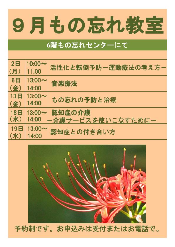 もの忘れセンターでは認知症への理解をご家族で深めていただくために、もの忘れ教室を無料で開催しております。今月は以下の日程と内容で、1回の教室につき6家族前後を対象として開催いたします。なお、地域の医療福祉関係者の方も対象としておりますので、ご希望の方は下記の当院もの忘れセンター受付までお問い合わせください。